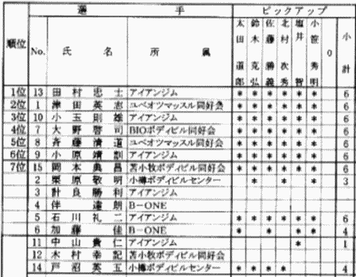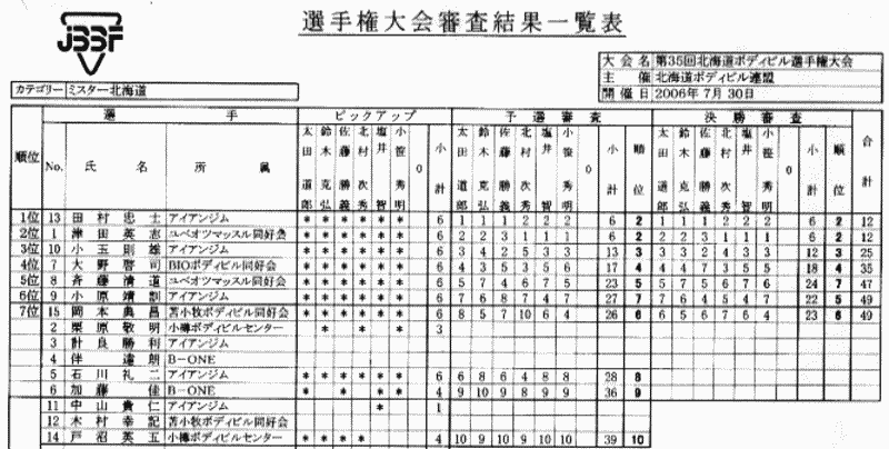 この大会(実は2006年北海道ボディビル選手権の審査表)では15名参加で、まずピックアップで予選審査進出者10名を決めます。