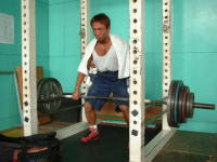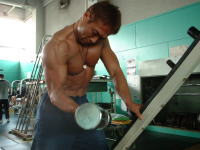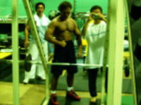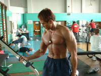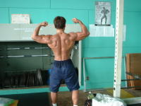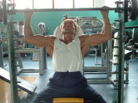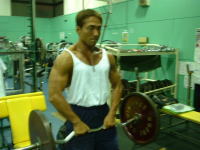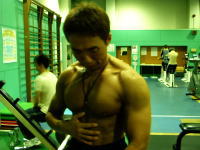 | ≪ 第3回 ≫ ザ・筋トレ男!ボディビルダー藤田選手のハードコア・ボディビルトレーニング 【画像1】 パンプ具合を確認する藤田選手 【画像2】 僧帽筋のハードトレーニング風景 ![]() ![]() ■大会前のボディビルトレーニングメニュー ![]() ![]() ≪ 脚 ≫ (1) スクワット ※レップが少なめで行なっている。それ以上は心肺機能運動になってしまう。更には腰痛防止効果もある。 (2) レッグカール ※スクワットと交互に行うためスクワットと同セット数 ![]() ![]() ≪ 胸 ≫ (1) スミスマシーン・インクラインプレス (2) インクライン・ダンベルフライ (3) マシーン・ディップス ※OFFにはベンチプレスも入れている場合があり。 ![]() ![]() ≪ 背 ≫ (1) ハーフ・デットリフト (2) ベントローイング ※ワイド(広い)とナロー(狭い)その日により違う手幅。ワイドは背中広がり、ナローは中心部を鍛えるため ![]() ![]() ≪ 肩 ≫ ※フロントとバックはセット間で違う。フロントは肩(顔)の前でかつぐこと、バックは肩(顔)の後でかつぐこと。 ※ワイド(広い)とナロー(狭い)その日により違う手幅。 (2) サイドレイズ 5セット (3) リアレイズ 3セット ![]() ![]() ≪ その他 ≫ 適当なところで… 腕(不定期) ※3日連続時もあり! 腹筋(毎日) ※ONの時、OFFはしない