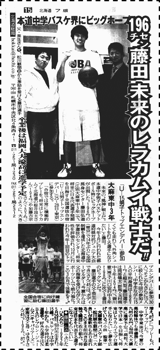 | ≪ 第30回 ≫ 藤田英生選手の熱血!ボディビル指導でバスケ界のホープ藤田弘道選手が誕生! ![]() 【スポーツ報知12月13日(木)より抜粋】 196センチ藤田 未来のレラカムイ戦士だ!! 北海道中学バスケ界にビックホープ 卒業後は福岡大大濠高に進学予定 【前書】 「U-15男子トップエンデバー」参加 大麻東中3年 【本文】 未来の"風神"戦士だ。北海道中学男子バスケットボール界にビックホープが出現した。196センチの長身センター藤田弘道(江別大麻東中3年・ユベオツマッスルボディビル同好会藤田英生選手息子)で、将来の日本代表選手発掘を目指す全国選抜合宿「U-15男子トップエンデバー」(25〜28日・東京)に参加する。 「合宿では常に積極的プレーを。将来はレラカムイ北海道の桜井良太さん(194センチ)や加藤吉宗さん(202センチ)のように、大きくても走れて、外角シュートを打てる選手になりたい」と藤田(ユベオツマッスルボディビル同好会藤田英生選手息子)。 今年3月に行われた都道府県対抗ジュニア大会(東京)で14年ぶりに全国制覇した北海道中学選抜のセンター。将来性を評価され、10月に行われた今年1回目のトップエンデバーに参加(30人)。そこからさらに15人に絞られた今回の参加メンバー。中学生ながら15人の平均身長は186.1センチと超大型。藤田選手は岡部健太(群馬・玉村南中3年・204センチ)、皆川徹(埼玉・川口安行中3年・198センチ)に次ぐ3番目のビッグマンだ。 藤田選手の父・英生(ひでき)さん(45)は、ボディビルダー(過去、北海道ボディビル選手権大会に出場)。今夏からは父の指導を受けながらスポーツジムで筋力強化。この3ヶ月で体重も7キロ増え、87キロに。プレーもパワーアップした。 中学卒業後は、今夏の高校総体でも準優勝した九州の名門・福岡大大濠高に進学予定。「高校、大学で日本一を目指し、将来はレラカムイでプロ選手になりたい」と夢を広げている。 ◆大麻東中バスケット部・松川朋也顧問(34) 「大きいが柔軟性もあり走れる。このまま前向きな姿勢で競技に取り組み、将来は日本を代表する選手になってもらいたい」 ◆藤田弘道(ふじた・ひろみち) 1992年5月29日、仙台市生まれ。15歳。バスケットは中学1年から。小学時代は柔道選手。好きな選手はNBAのレブロン・ジェームズ(キャバリアーズ)。家族は父・藤田英生さん(ユベオツマッスルボディビル同好会)と母・ゆき子さん(45)。196センチ、87キロ。 ※補足 藤田弘道選手(江別大麻東中)はただ大きいだけでなく、パワフルでかつ柔軟な動きができる期待のホープに成長した要因にはボディビルが関与する所が大きかったと思います。「ウェイトトレーニングをしてはスポーツにはマイナスだ!見せ掛けの役に立たない筋肉だ!」 「誰にも負けない "根性" と "気力" さえあれば上に行ける!」 などと言っている古臭い方々もいるが、今回のユベオツマッスルボディビル同好会の藤田英生選手による弘道選手へのボディビル理論に基づいた科学的指導で、見事にそうではない!という事が証明されました。スクワットからベンチプレスまでマンツーマンで徹底的に指導をしたとの事。かつ栄養面や休息面では自身もボディービルダーである経験を大いに生かし、効率的なアドバイスをした様です。 ボディビルは全てのスポーツの基本軸となる キング・オブ・スポーツ であり、キング・オブ・ボディビル であると思った今日この頃でした…。 報告: ユベオツマッスル同好会事務局 津田英志